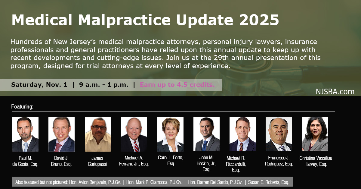 Paul will be moderating the 29th annual presentation of this essential program designed for attorneys who handle medical malpractice cases. This half-day, fast-paced program will deliver the newest cases, proven tactics, and emerging trends in one engaging session—taught by a virtual who’s who of the New Jersey medical malpractice bar. This seminar is trusted each year by attorneys, insurance professionals, and general practitioners.
