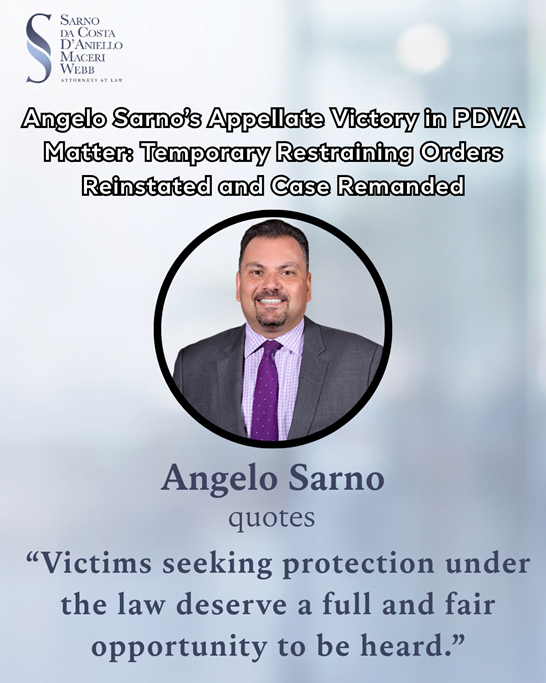 Sarno da Costa D’Aniello Maceri Webb LLC is proud to share a significant appellate victory from Angelo Sarno on behalf of our client in a matter arising under New Jersey’s Prevention of Domestic Violence Act (PDVA). In a decision issued on March 24, 2026, the Appellate Division reversed the dissolution of amended temporary restraining orders (ATROs), ordered that those restraints be immediately reinstated, and remanded the matter for further proceedings. The court also directed that the plaintiff be permitted to amend the ATROs to include allegations contained in the previously denied February 24, 2025 TRO applications, and that the final restraining order hearing be scheduled within thirty days.