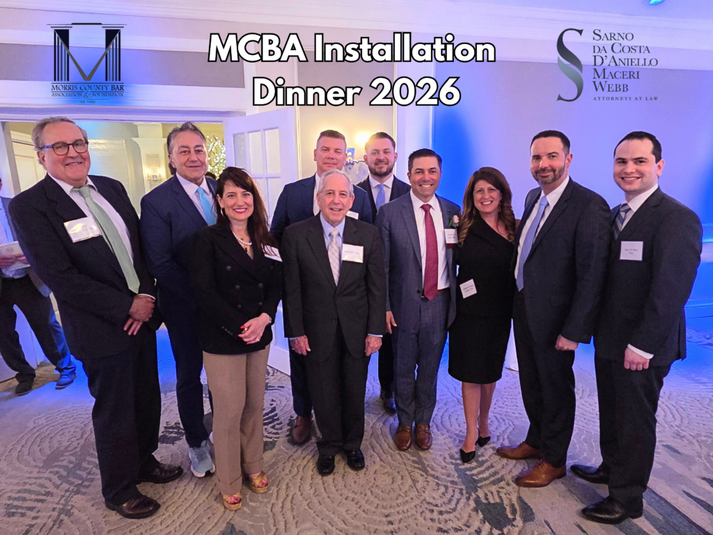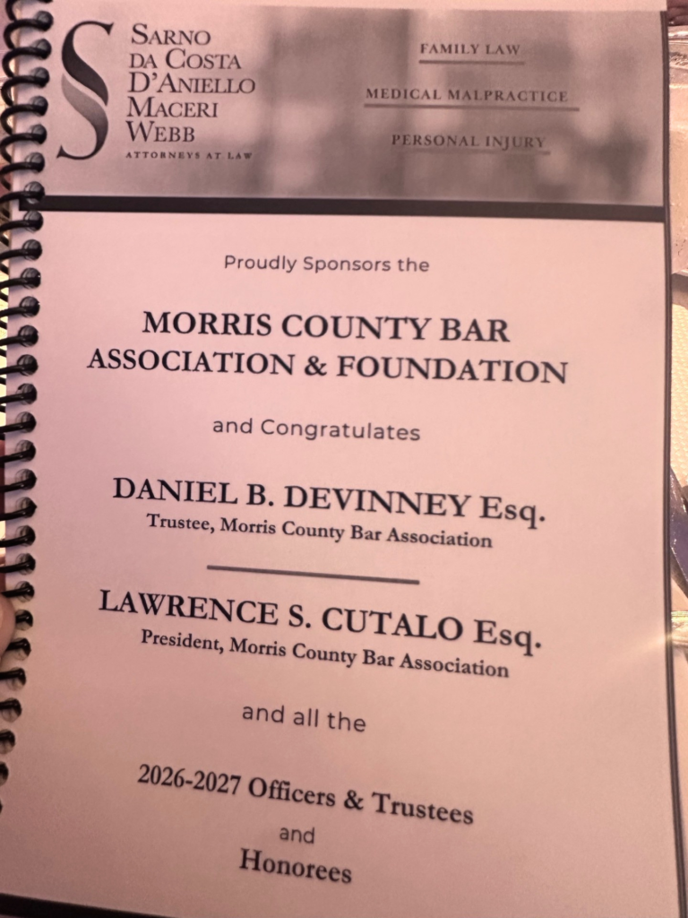 Captured at the Morris County Bar Association (“MCBA”) Installation dinner, these photos reflect a special evening celebrating leadership and service within the legal community. Join us in congratulating Partner, Daniel Devinney, Esq., on his installation as a Trustee with the MCBA for 2026, an honor that recognizes his dedication, professionalism, and continued commitment to the advancement of the Bar.